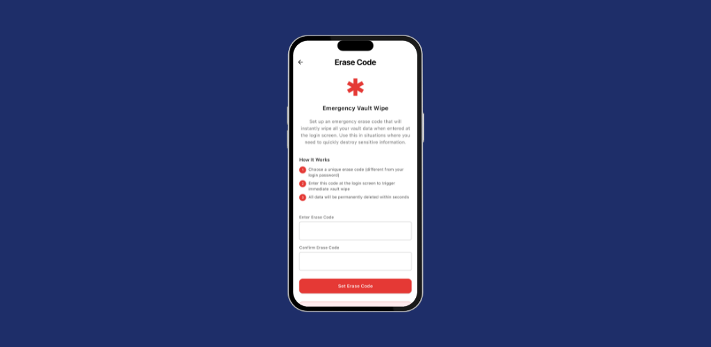 Never handover your credentials enter your erase code at login to delete your vault in dangerous situations.